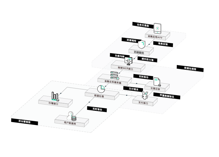 基于数据湾优质的CN2直连线路,将整体架构分割为后台管理、数据处理、业务交易三大模块,相互通过进行物理隔离确保数据安全
